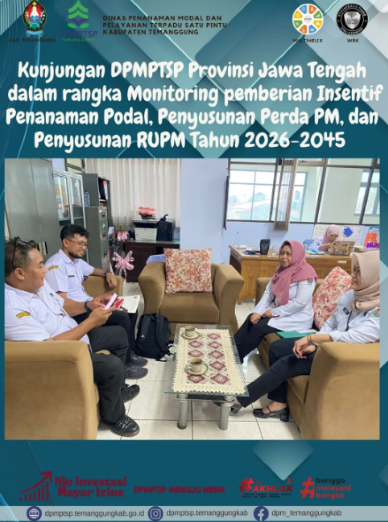 Berita Kategori: Smart Government (Pemerintah Cerdas) Sekretariat Jumat, 11/07/2025 09:30 10 Kegiatan DPMPTSP Selengkapnya Kategori: Smart Government (Pemerintah Cerdas) Sekretariat Kamis, 10/07/2025 16:18 12 Layanan Jempol Boss KDMP Kecamatan Selopampang Selengkapnya Kategori: Smart Government (Pemerintah Cerdas) Sekretariat Kamis, 10/07/2025 09:30 13 Pengumuman Selengkapnya Kategori: Smart Government (Pemerintah Cerdas) Sekretariat Rabu, 09/07/2025 16:26 14 Kunjungan Dari DPMPTSP Prov.Jateng Selengkapnya Kategori: Smart Government (Pemerintah Cerdas) Sekretariat Rabu, 09/07/2025 16:07 15 Rencana Investasi Sektor Pertanian Selengkapnya Kategori: Smart Government (Pemerintah Cerdas) Sekretariat Rabu, 09/07/2025 09:30 7 Pengumuman Selengkapnya Kategori: Smart Government (Pemerintah Cerdas) Sekretariat Selasa, 08/07/2025 16:21 12 pendampingan Jempol Boss KDMP Selengkapnya Kategori: Pengumuman Sekretariat Selasa, 08/07/2025 16:16 94 LAPORAN KEGIATAN PENANAMAN MODAL Selengkapnya Kategori: Smart Government (Pemerintah Cerdas) Sekretariat Selasa, 08/07/2025 16:13 10 Kerjasama dengan KPP Pratama Selengkapnya Kategori: Smart Government (Pemerintah Cerdas) Sekretariat Selasa, 08/07/2025 16:09 10 Inovasi GAMPIL Selengkapnya Kategori: Smart Government (Pemerintah Cerdas) Sekretariat Selasa, 08/07/2025 09:29 12 Kegiatan DPMPTSP Selengkapnya Kategori: Lainnya Sekretariat Senin, 07/07/2025 16:11 42 Forum PTSP se-Jawa Tengah Selengkapnya FirstPrev9091929394NextLast