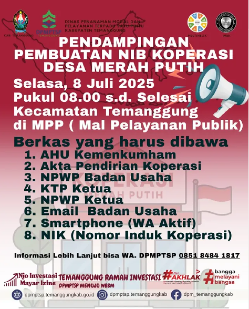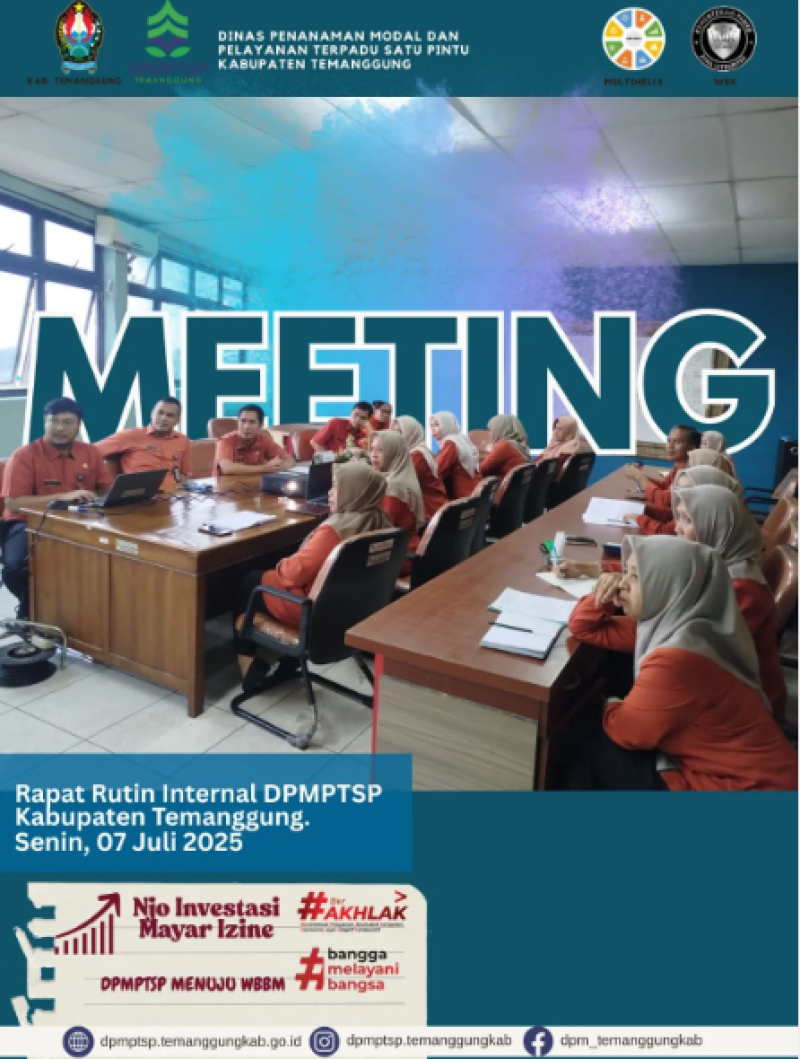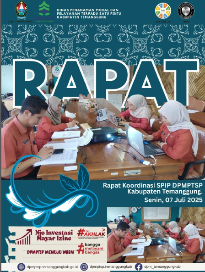 Berita Kategori: Smart Government (Pemerintah Cerdas) Sekretariat Senin, 07/07/2025 16:05 14 Rapat Internal DPMPTSP Selengkapnya Kategori: Smart Government (Pemerintah Cerdas) Sekretariat Senin, 07/07/2025 16:03 15 Rapat Internal DPMPTSP Selengkapnya Kategori: Smart Government (Pemerintah Cerdas) Sekretariat Senin, 07/07/2025 16:01 14 JADWAL PENDAMPINGAN NIB KOPERASI DESA MERAH PUTIH Selengkapnya Kategori: Smart Government (Pemerintah Cerdas) Sekretariat Senin, 07/07/2025 16:00 15 JADWAL PENDAMPINGAN NIB KOPERASI DESA MERAH PUTIH Selengkapnya Kategori: Smart Government (Pemerintah Cerdas) Sekretariat Senin, 07/07/2025 15:58 16 JADWAL PENDAMPINGAN NIB KOPERASI DESA MERAH PUTIH Selengkapnya Kategori: Smart Government (Pemerintah Cerdas) Sekretariat Senin, 07/07/2025 09:29 9 Pengumuman Selengkapnya Kategori: Smart Government (Pemerintah Cerdas) Sekretariat Minggu, 06/07/2025 09:29 8 Pengumuman Selengkapnya Kategori: Pengumuman Sekretariat Sabtu, 05/07/2025 16:05 151 Layanan Kantor Imigrasi ( Pembuatan E-Paspor ) di MPP Talaga Sevaka Kabupaten Temanggung Selengkapnya Kategori: Smart Government (Pemerintah Cerdas) Sekretariat Sabtu, 05/07/2025 09:29 10 Pengumuman Selengkapnya Kategori: Pengumuman Sekretariat Jumat, 04/07/2025 22:35 132 Syarat Pembuatan NIB KoperasiDesa Merah Putih Selengkapnya Kategori: Pengumuman Sekretariat Jumat, 04/07/2025 16:03 113 Layanan Jempol Boss KDMP Kecamatan Tembarak Selengkapnya Kategori: Pengumuman Sekretariat Jumat, 04/07/2025 16:03 124 Layanan Jempol Boss KDMP Kecamatan Parakan Selengkapnya FirstPrev9192939495NextLast