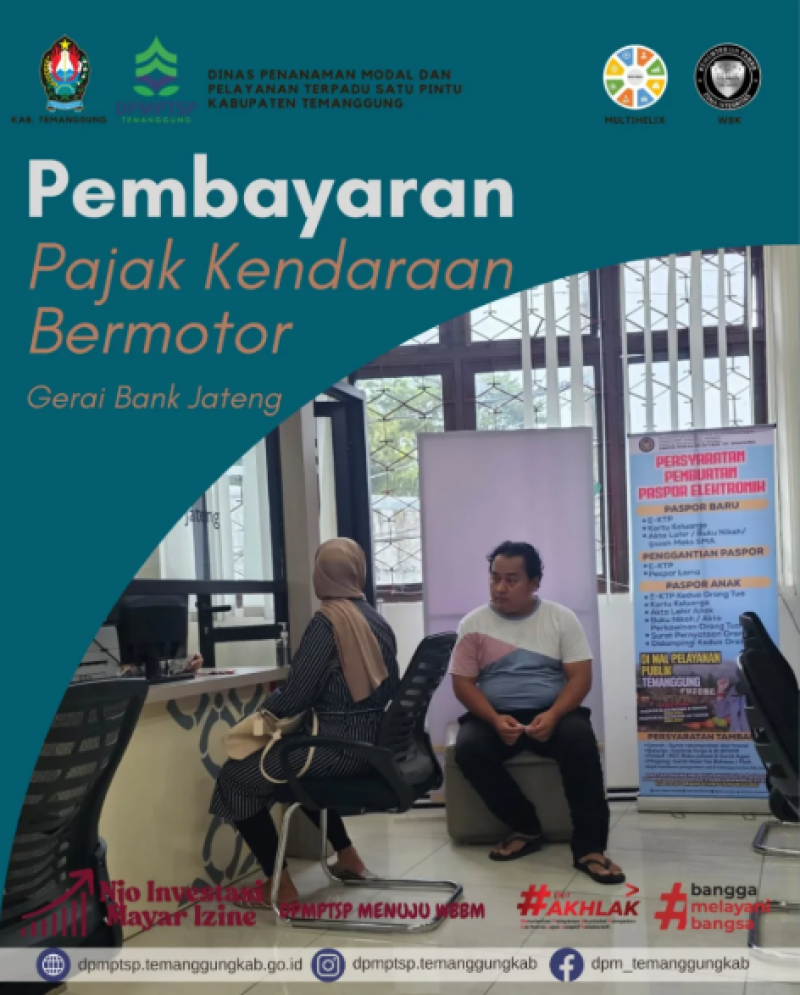 Berita Kategori: Smart Economy (Ekonomi Cerdas) Sekretariat Selasa, 17/06/2025 09:54 66 Potensi Investasi Kabupaten Temanggung Selengkapnya Kategori: Lainnya Sekretariat Selasa, 17/06/2025 09:49 30 Layanan Inovasi DPMPTSP Selengkapnya Kategori: Lainnya Sekretariat Selasa, 17/06/2025 09:45 29 lAYANAN BANK JATENG DI GERAI MPP Selengkapnya Kategori: Smart Government (Pemerintah Cerdas) Sekretariat Senin, 16/06/2025 16:20 11 Pengumuman Selengkapnya Kategori: Smart Government (Pemerintah Cerdas) Sekretariat Senin, 16/06/2025 15:40 8 Kegiatan DPMPTSP Selengkapnya Kategori: Smart Government (Pemerintah Cerdas) Sekretariat Senin, 16/06/2025 15:39 9 Kegiatan DPMPTSP Selengkapnya Kategori: Smart Government (Pemerintah Cerdas) Sekretariat Senin, 16/06/2025 11:37 10 Kegiatan DPMPTSP Selengkapnya Kategori: Lainnya Sekretariat Senin, 16/06/2025 09:52 31 STOP Gratifikasi, Uang Pelicin, Pemerasan dan Suap Selengkapnya Kategori: Lainnya Sekretariat Senin, 16/06/2025 09:47 34 Pelayanan Gerai DPUPR di MPP Selengkapnya Kategori: Lainnya Sekretariat Senin, 16/06/2025 09:43 35 Pelayanan SAMSAT di Gerai MPP Selengkapnya Kategori: Smart Government (Pemerintah Cerdas) Sekretariat Jumat, 13/06/2025 11:32 11 Pengumuman Selengkapnya Kategori: Smart Government (Pemerintah Cerdas) Sekretariat Jumat, 13/06/2025 11:31 9 Kegiatan DPMPTSP Selengkapnya FirstPrev102103104105106NextLast