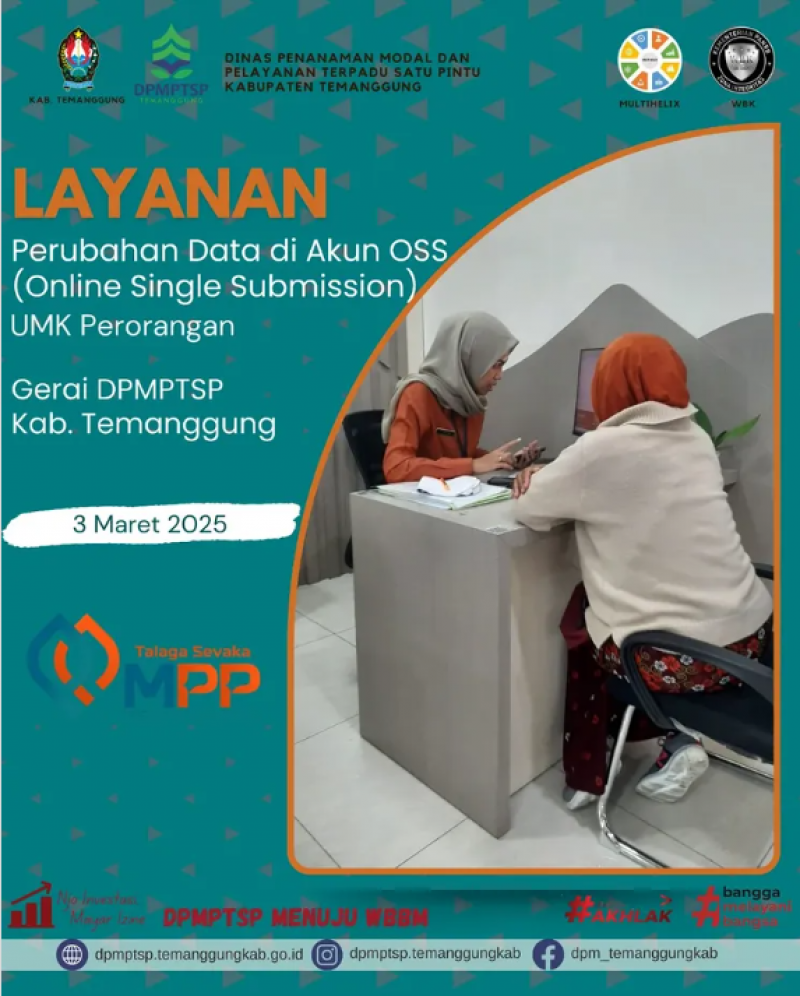 Berita Kategori: Smart Government (Pemerintah Cerdas) Sekretariat Selasa, 04/03/2025 13:21 21 Pengumuman Selengkapnya Kategori: Smart Society (Masyarakat Cerdas) Sekretariat Selasa, 04/03/2025 13:20 71 Pengumuman Selengkapnya Kategori: Lainnya Sekretariat Selasa, 04/03/2025 07:32 147 World Wildlife Day Selengkapnya Kategori: Lainnya Sekretariat Senin, 03/03/2025 14:33 94 Yuk Investasi di Temanggung!!! Selengkapnya Kategori: Lainnya Sekretariat Senin, 03/03/2025 14:32 87 Layanan Pembuatan Perizinan KKPR Berusaha Perorangan Selengkapnya Kategori: Lainnya Sekretariat Senin, 03/03/2025 14:31 105 Pendampingan Pembuatan Nomor Induk Berusaha Selengkapnya Kategori: Lainnya Sekretariat Senin, 03/03/2025 14:29 93 jadwal layanan yang ada di MPP Talaga Sevaka Selengkapnya Kategori: Lainnya Sekretariat Senin, 03/03/2025 14:28 77 Dirgahayu ke-74 Satuan Polisi Pamong Praja dan Dirgahayu ke-62 Satuan Pelindungan Masyarakat. Salam Praja Wibawa Selengkapnya Kategori: Lainnya Sekretariat Senin, 03/03/2025 14:26 74 Dirgahayu ke-74 Satuan Polisi Pamong Praja Selengkapnya Kategori: Lainnya Sekretariat Senin, 03/03/2025 14:25 81 Rapat Internal DPMPTSP Selengkapnya Kategori: Lainnya Sekretariat Senin, 03/03/2025 14:23 70 Layanan Gerai MPP Talaga Sevaka Selengkapnya Kategori: Lainnya Sekretariat Senin, 03/03/2025 14:21 64 pelayanan publik bagi kelompok rentan Selengkapnya FirstPrev133134135136137NextLast