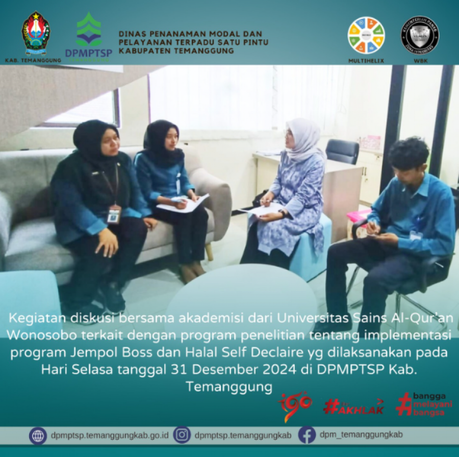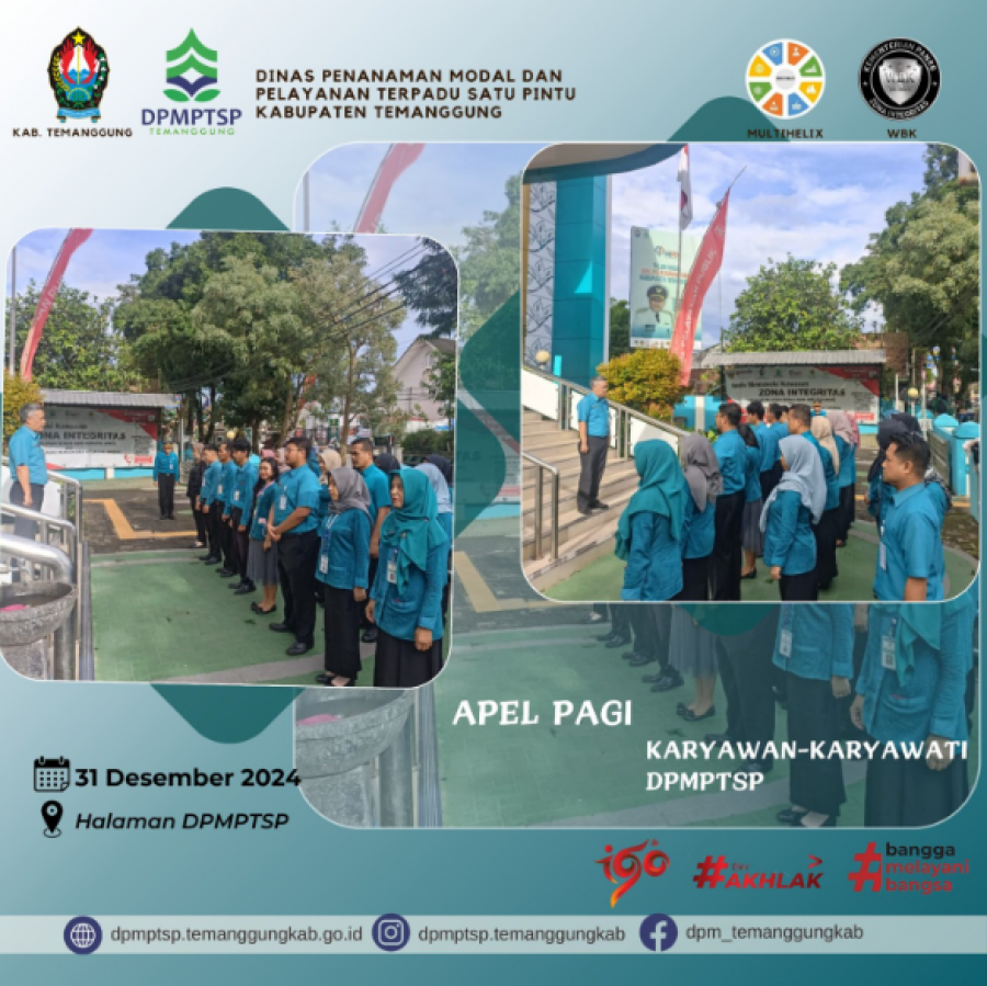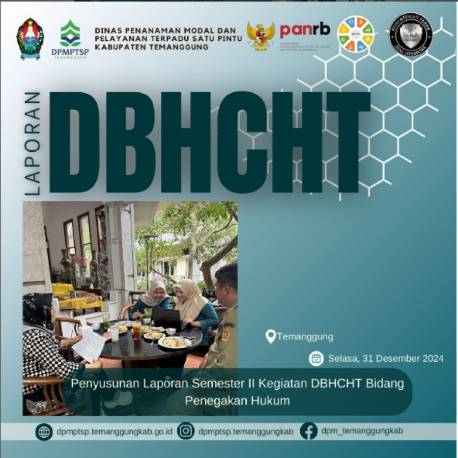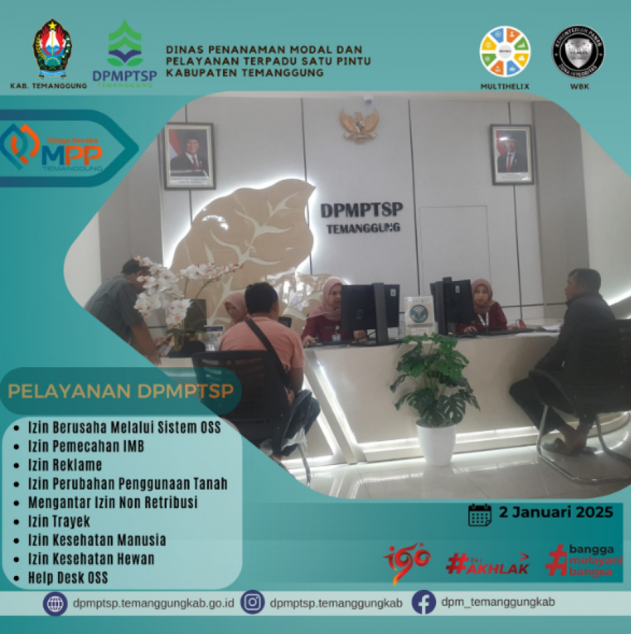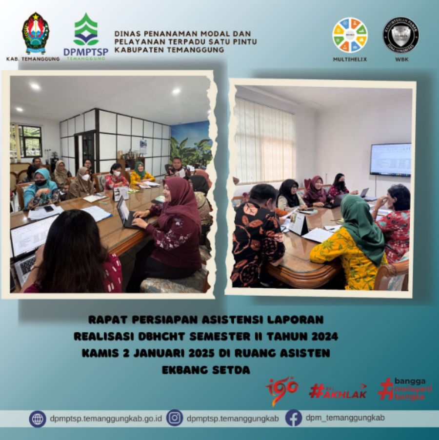 Berita Kategori: Lainnya Sekretariat Kamis, 02/01/2025 10:15 93 Rapat Persiapan Asistensi Laporan Realisasi DBHCHT Selengkapnya Kategori: Lainnya Sekretariat Kamis, 02/01/2025 10:08 52 DPMPTSP Kabupaten Temanggung hadir melayani sepenuh hati Selengkapnya Kategori: Lainnya Sekretariat Rabu, 01/01/2025 11:54 35 Alur Pembuatan NIB Selengkapnya Kategori: Lainnya Sekretariat Rabu, 01/01/2025 10:04 53 Selamat datang 2025 DPMPTSP makin PRIMA Selengkapnya Kategori: Lainnya Sekretariat Selasa, 31/12/2024 15:41 81 SELAMAT TAHUN BARU 2025 Selengkapnya Kategori: Lainnya Sekretariat Selasa, 31/12/2024 15:40 81 Layanan PIRT pada gerai DPMPTSP Kabupaten Temanggung Selengkapnya Kategori: Lainnya Sekretariat Selasa, 31/12/2024 15:39 69 Penyampaian LKPM untuk Triwulan IV Selengkapnya Kategori: Lainnya Sekretariat Selasa, 31/12/2024 15:38 148 Diskusi bersama akademisi dari Universitas Sains Al-Qur'an Wonosobo Selengkapnya Kategori: Lainnya Sekretariat Selasa, 31/12/2024 15:37 84 Penyusunan laporan Semester II Kegiatan DBHCHT Bidang Penegakan Hukum Selengkapnya Kategori: Lainnya Sekretariat Selasa, 31/12/2024 15:36 71 Diskusi Olah Data Realisasi Investasi Tahun 2024 Selengkapnya Kategori: Lainnya Sekretariat Selasa, 31/12/2024 15:35 94 Apel Pagi Rutin Karyawan Karyawati DPMPTSP Kabupaten Temanggung Selengkapnya Kategori: Lainnya Sekretariat Selasa, 31/12/2024 15:34 82 Rapat Evaluasi Internal Pelayanan Perizinan DPMPTSP Kabupaten Temanggung Selengkapnya FirstPrev156157158159160NextLast