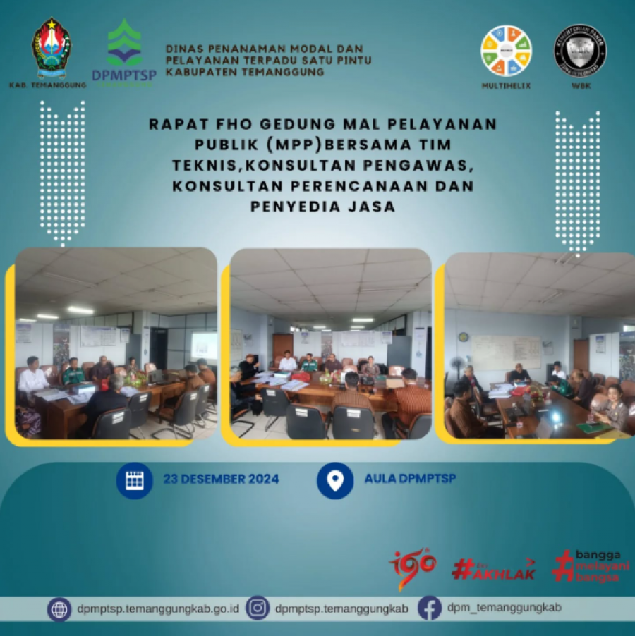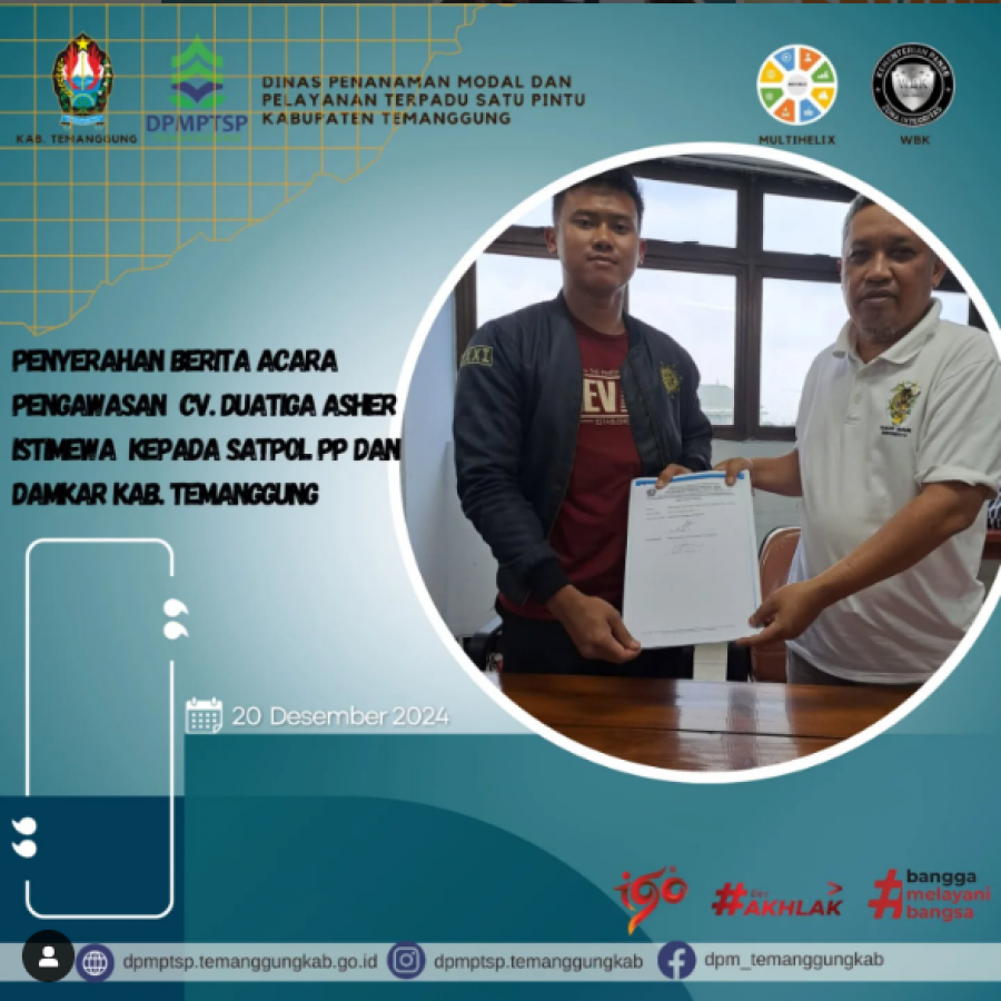 Berita Kategori: Lainnya Sekretariat Rabu, 25/12/2024 15:10 73 Selamat Hari Natal 2024 Selengkapnya Kategori: Lainnya Sekretariat Selasa, 24/12/2024 15:11 68 Sosialisasi Penyusunan LKJIP 2024 Selengkapnya Kategori: Lainnya Sekretariat Selasa, 24/12/2024 15:09 59 Desk Audit Kinerja Kegiatan Penanaman Modal Selengkapnya Kategori: Smart Society (Masyarakat Cerdas) Sekretariat Selasa, 24/12/2024 10:32 86 Panduan Pembuatan NIB Selengkapnya Kategori: Lainnya Sekretariat Senin, 23/12/2024 15:08 49 Rapat Pembahasan Kerangka Acuan Formulir Dokumen Persetujuan Lingkungan Selengkapnya Kategori: Lainnya Sekretariat Senin, 23/12/2024 15:06 45 Upacara Peringatan Hari Ibu ke 96 Selengkapnya Kategori: Pengumuman Sekretariat Senin, 23/12/2024 15:05 119 Pastikan izin tenaga kesehatan ataupun tenaga medismu sudah terbit melalui MPPD Selengkapnya Kategori: Pengumuman Sekretariat Senin, 23/12/2024 15:04 121 WASPADA..Penipuan OSS Nomor Whatsapp Selengkapnya Kategori: Lainnya Sekretariat Senin, 23/12/2024 15:02 47 Apel Luar Biasa Selengkapnya Kategori: Lainnya Sekretariat Senin, 23/12/2024 15:00 46 Rapat Pra FHO Gedung MPP Selengkapnya Kategori: Lainnya Sekretariat Senin, 23/12/2024 14:59 46 Berita Acara PengawaPenyerahan Berita Acara Pengawasansan Selengkapnya Kategori: Lainnya Sekretariat Minggu, 22/12/2024 14:58 39 Selamat Hari Ibu untuk perempuan yang luar biasa Selengkapnya FirstPrev158159160161162NextLast