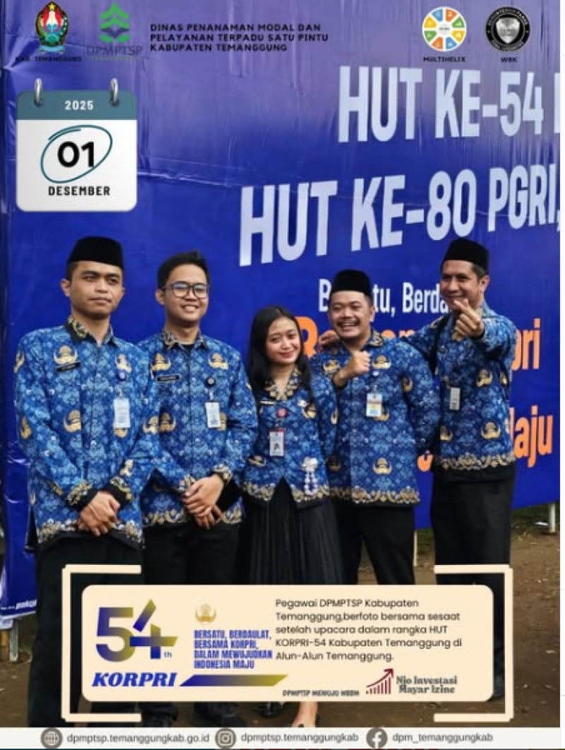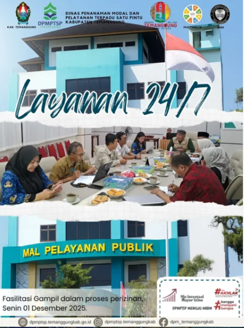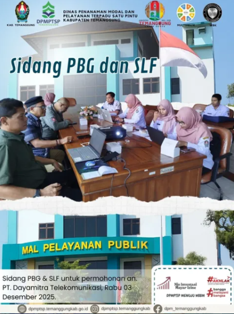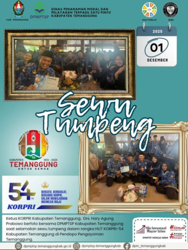 Kategori Lainnya Kategori: Lainnya Fungsional Pelayanan Terpadu Satu Pintu 03 Desember 2025 09:47:00 5 Layanan 24/7 Selengkapnya Kategori: Lainnya Fungsional Pelayanan Terpadu Satu Pintu 03 Desember 2025 09:45:00 3 Sidang Permohonan SLF Selengkapnya Kategori: Lainnya Fungsional Penanaman Modal 02 Desember 2025 13:17:00 2 Kegiatan Pengawasan Penanaman Modal Selengkapnya Kategori: Lainnya Sekretariat 02 Desember 2025 10:22:00 0 Jenis Layanan Selengkapnya Kategori: Lainnya Sekretariat 02 Desember 2025 09:43:00 3 HUT KORPRI ke-54 Tahun 2025 Selengkapnya Kategori: Lainnya Sekretariat 02 Desember 2025 09:40:00 3 SEWU TUMPENG Selengkapnya Kategori: Lainnya Fungsional Pelayanan Terpadu Satu Pintu 01 Desember 2025 22:49:00 19 Rapat Program MBG Selengkapnya Kategori: Lainnya Sekretariat 01 Desember 2025 22:47:00 16 HUT KORPRI ke-54 Tahun 2025 Selengkapnya Kategori: Lainnya Sekretariat 01 Desember 2025 10:21:00 0 Jenis Layanan Selengkapnya Kategori: Lainnya Sekretariat 24 November 2025 13:00:00 18 Apel Pagi karyawan-karyawati DPMPTSP Kabupaten Temanggung Selengkapnya Kategori: Lainnya Fungsional Penanaman Modal 21 November 2025 12:28:00 15 Sosialisasi Realisasi Investasi Selengkapnya Kategori: Lainnya Sekretariat 21 November 2025 12:25:00 17 Santapan Rohani Selengkapnya FirstPrev23456NextLast
