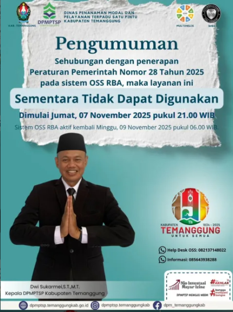 Kategori Pengumuman Kategori: Pengumuman Sekretariat 01 Desember 2025 22:51:00 25 HARI AIDS SEDUNIA Selengkapnya Kategori: Pengumuman Fungsional Pelayanan Terpadu Satu Pintu 19 November 2025 19:06:00 26 Layanan Aduan Pemkab Temanggung Selengkapnya Kategori: Pengumuman Sekretariat 19 November 2025 18:51:00 25 Jalan Sehat Dalam Rangka Hari Jadi Kab.Temanggung ke-191 Selengkapnya Kategori: Pengumuman Sekretariat 19 November 2025 18:50:00 27 Jalan Sehat Dalam Rangka Hari Jadi Kab.Temanggung ke-191 Selengkapnya Kategori: Pengumuman Sekretariat 19 November 2025 18:49:00 20 Jalan Sehat Dalam Rangka Hari Jadi Kab.Temanggung ke-191 Selengkapnya Kategori: Pengumuman Sekretariat 19 November 2025 18:47:00 14 Jalan Sehat Dalam Rangka Hari Jadi Kab.Temanggung ke-191 Selengkapnya Kategori: Pengumuman Fungsional Pelayanan Terpadu Satu Pintu 17 November 2025 18:22:00 20 Layanan di MPP Talag Sevaka Selengkapnya Kategori: Pengumuman Fungsional Pelayanan Terpadu Satu Pintu 11 November 2025 18:01:00 12 Tarif Paspor di MPP Selengkapnya Kategori: Pengumuman Sekretariat 10 November 2025 19:32:00 20 SELAMAT HARI PAHLAWAN Selengkapnya Kategori: Pengumuman Fungsional Pelayanan Terpadu Satu Pintu 10 November 2025 17:53:00 14 Perubahan alur proses OSS-RBA Selengkapnya Kategori: Pengumuman Fungsional Pelayanan Terpadu Satu Pintu 06 November 2025 19:25:00 16 Sistem Online Single Submission (OSS) Selengkapnya Kategori: Pengumuman Sekretariat 01 Oktober 2025 12:19:00 13 Pengumuman Selengkapnya 123NextLast