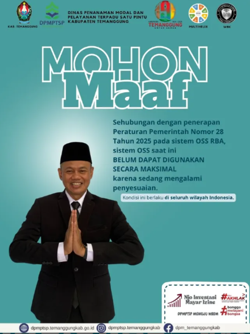Kategori Pengumuman Kategori: Pengumuman Sekretariat 01 Desember 2025 22:51:00 25 HARI AIDS SEDUNIA Selengkapnya Kategori: Pengumuman Fungsional Pelayanan Terpadu Satu Pintu 19 November 2025 19:06:00 27 Layanan Aduan Pemkab Temanggung Selengkapnya Kategori: Pengumuman Sekretariat 19 November 2025 18:51:00 26 Jalan Sehat Dalam Rangka Hari Jadi Kab.Temanggung ke-191 Selengkapnya Kategori: Pengumuman Sekretariat 19 November 2025 18:50:00 28 Jalan Sehat Dalam Rangka Hari Jadi Kab.Temanggung ke-191 Selengkapnya Kategori: Pengumuman Sekretariat 19 November 2025 18:49:00 22 Jalan Sehat Dalam Rangka Hari Jadi Kab.Temanggung ke-191 Selengkapnya Kategori: Pengumuman Sekretariat 19 November 2025 18:47:00 15 Jalan Sehat Dalam Rangka Hari Jadi Kab.Temanggung ke-191 Selengkapnya Kategori: Pengumuman Fungsional Pelayanan Terpadu Satu Pintu 17 November 2025 18:22:00 22 Layanan di MPP Talag Sevaka Selengkapnya Kategori: Pengumuman Fungsional Pelayanan Terpadu Satu Pintu 11 November 2025 18:01:00 13 Tarif Paspor di MPP Selengkapnya Kategori: Pengumuman Sekretariat 10 November 2025 19:32:00 21 SELAMAT HARI PAHLAWAN Selengkapnya Kategori: Pengumuman Fungsional Pelayanan Terpadu Satu Pintu 10 November 2025 17:53:00 15 Perubahan alur proses OSS-RBA Selengkapnya Kategori: Pengumuman Fungsional Pelayanan Terpadu Satu Pintu 06 November 2025 19:25:00 17 Sistem Online Single Submission (OSS) Selengkapnya Kategori: Pengumuman Sekretariat 01 Oktober 2025 12:19:00 14 Pengumuman Selengkapnya 123NextLast
