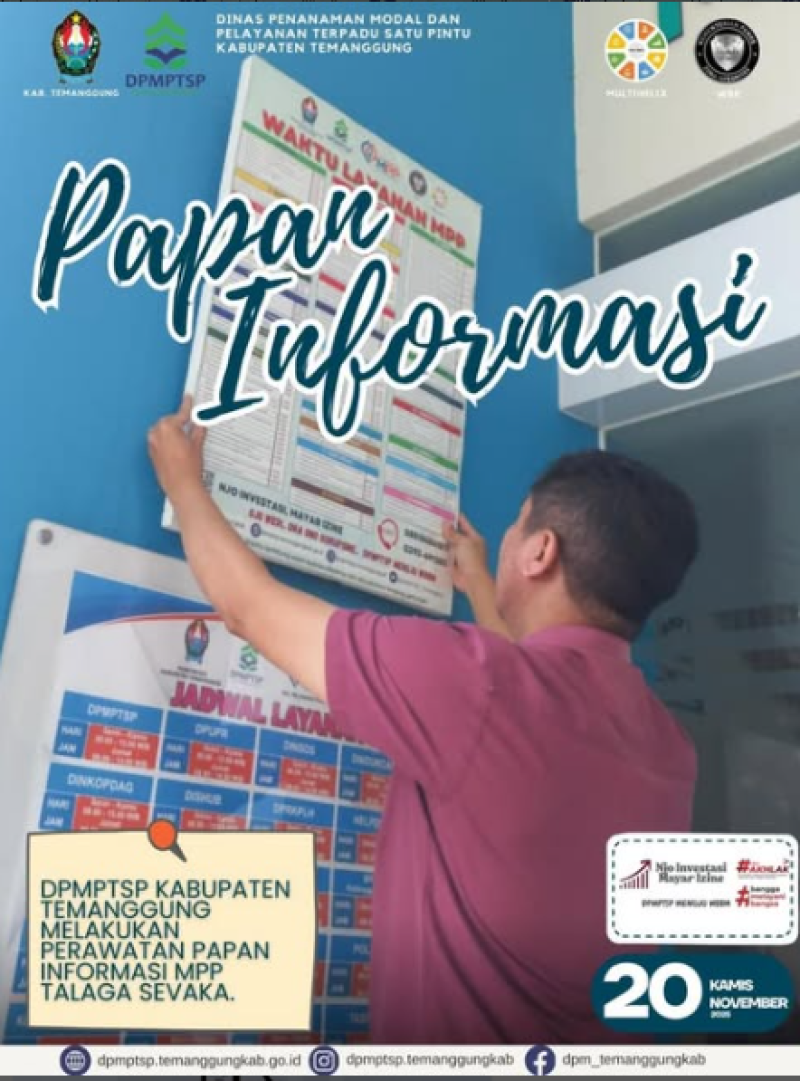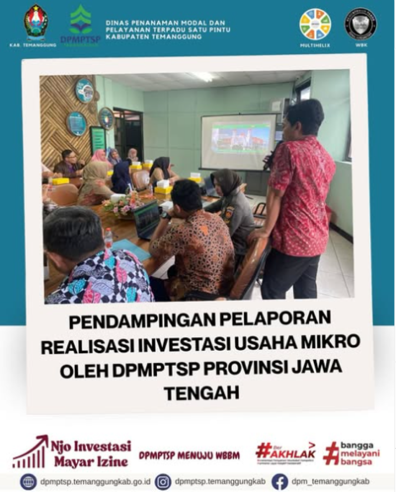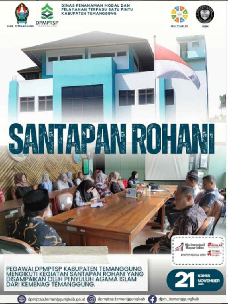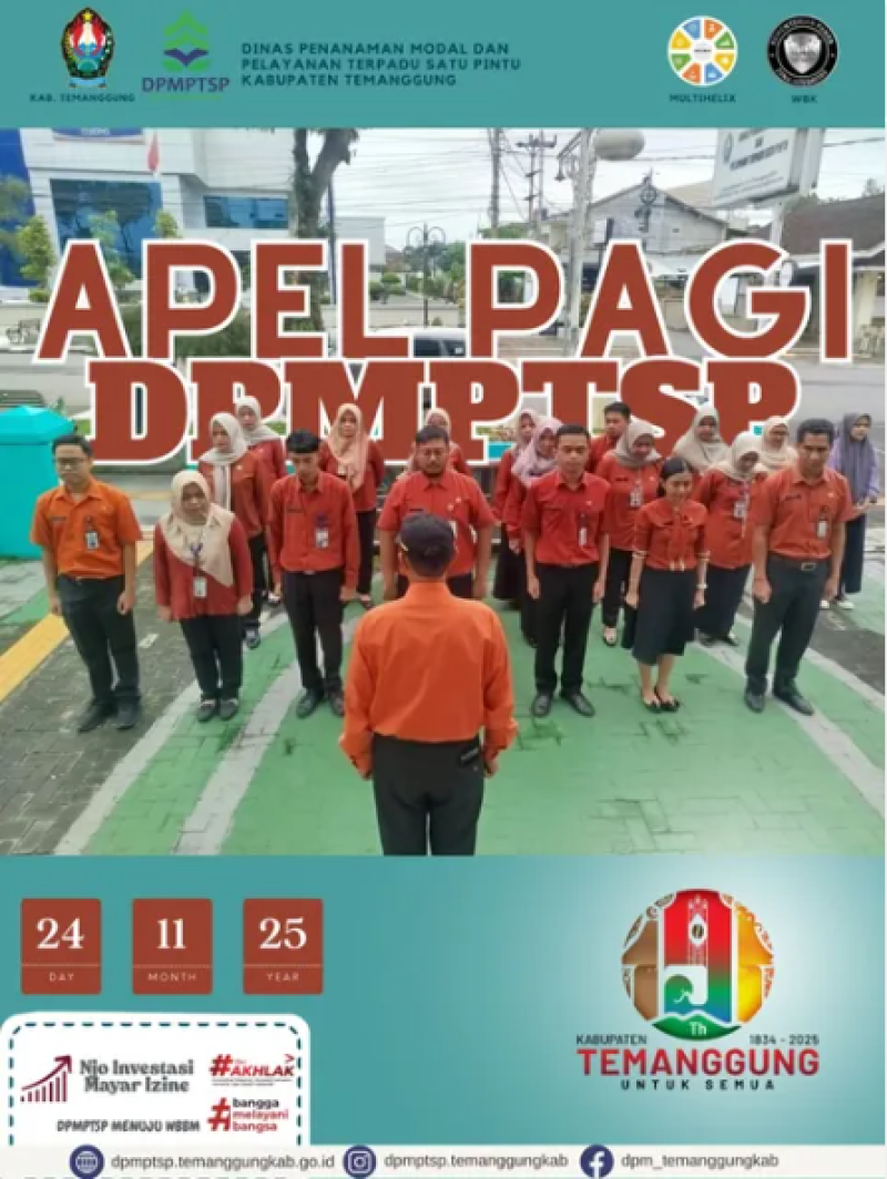 Kategori Lainnya Kategori: Pengumuman , Lainnya 01 Desember 2025 22:51:00 25 HARI AIDS SEDUNIA Selengkapnya Kategori: Lainnya , Lainnya 01 Desember 2025 22:49:00 14 Rapat Program MBG Selengkapnya Kategori: Lainnya , Lainnya 01 Desember 2025 22:47:00 9 HUT KORPRI ke-54 Tahun 2025 Selengkapnya Kategori: Lainnya , Lainnya 24 November 2025 13:00:00 12 Apel Pagi karyawan-karyawati DPMPTSP Kabupaten Temanggung Selengkapnya Kategori: Smart Living (Hidup Cerdas) , Lainnya 23 November 2025 12:41:00 28 Jalan Sehat Dalam Rangka Hari Jadi Kab.Temanggung ke-191 Selengkapnya Kategori: Smart Living (Hidup Cerdas) , Lainnya 23 November 2025 12:32:00 30 Jalan Sehat Dalam Rangka Hari Jadi Kab.Temanggung ke-191 Selengkapnya Kategori: Lainnya , Lainnya 21 November 2025 12:28:00 10 Sosialisasi Realisasi Investasi Selengkapnya Kategori: Lainnya , Lainnya 21 November 2025 12:25:00 9 Santapan Rohani Selengkapnya Kategori: Lainnya , Lainnya 20 November 2025 12:29:00 9 Pendampingan Pelaporan Realisasi Investasi Selengkapnya Kategori: Lainnya , Lainnya 20 November 2025 12:23:00 7 Proses Penanganan Aduan Selengkapnya Kategori: Lainnya , Lainnya 20 November 2025 12:21:00 10 Proses Izin Reklame Selengkapnya Kategori: Lainnya , Lainnya 20 November 2025 12:18:00 9 Perawatan Sarpras MPP Selengkapnya 123NextLast